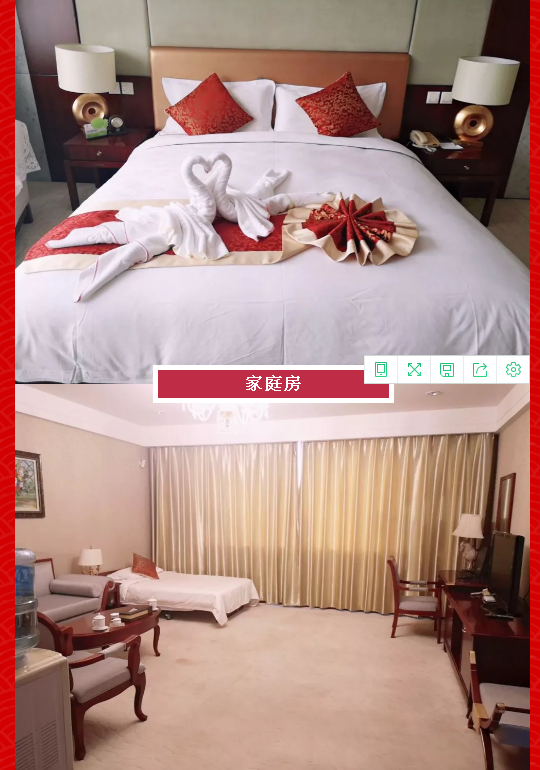2.主樓標準間320元/間,2號樓標準間220元/間(以上標準間均含雙早),家庭房780元/間(含三早)。